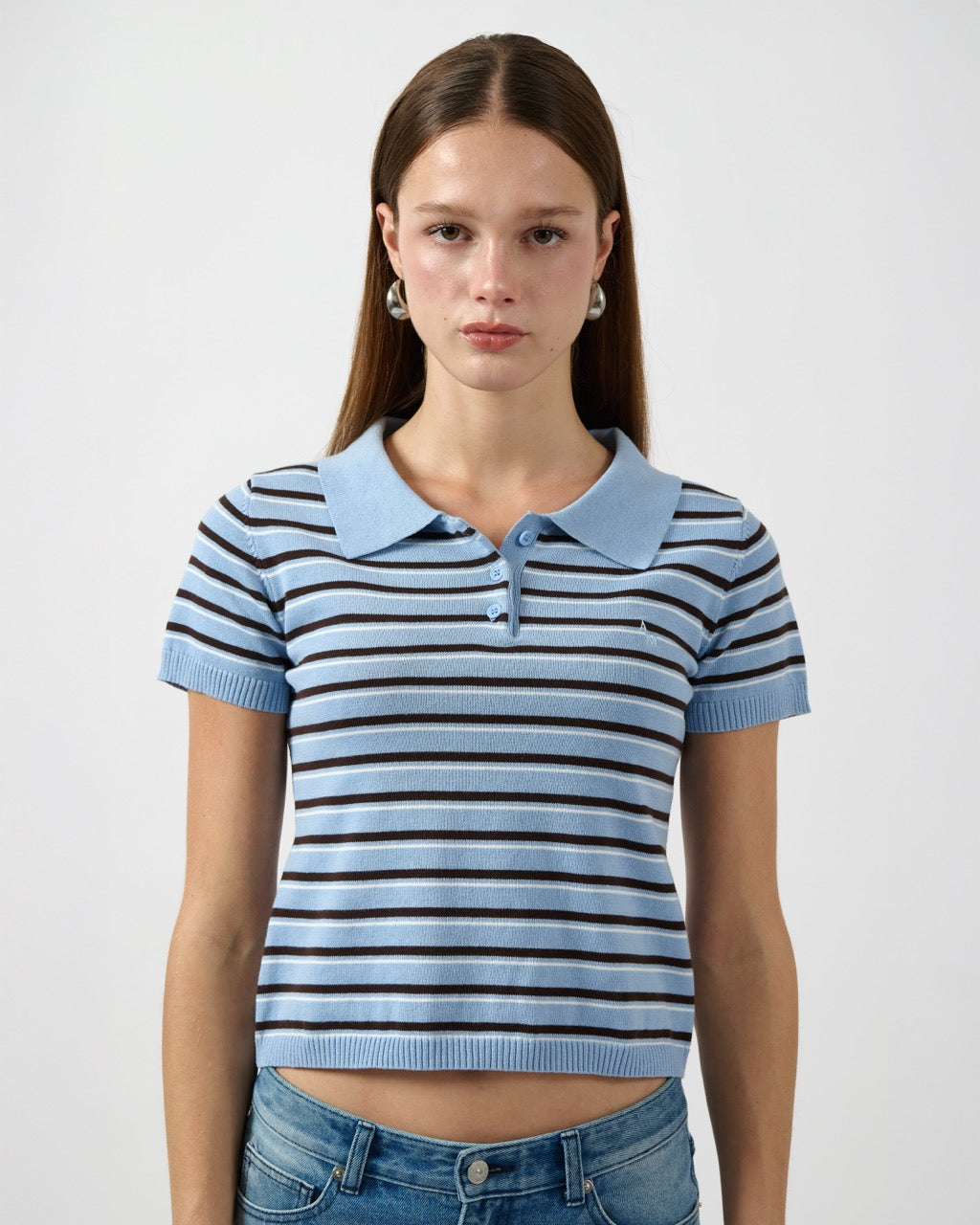 AIMER Denim Edition - Knitted Polo Top in Blue Dark Brown Stripe